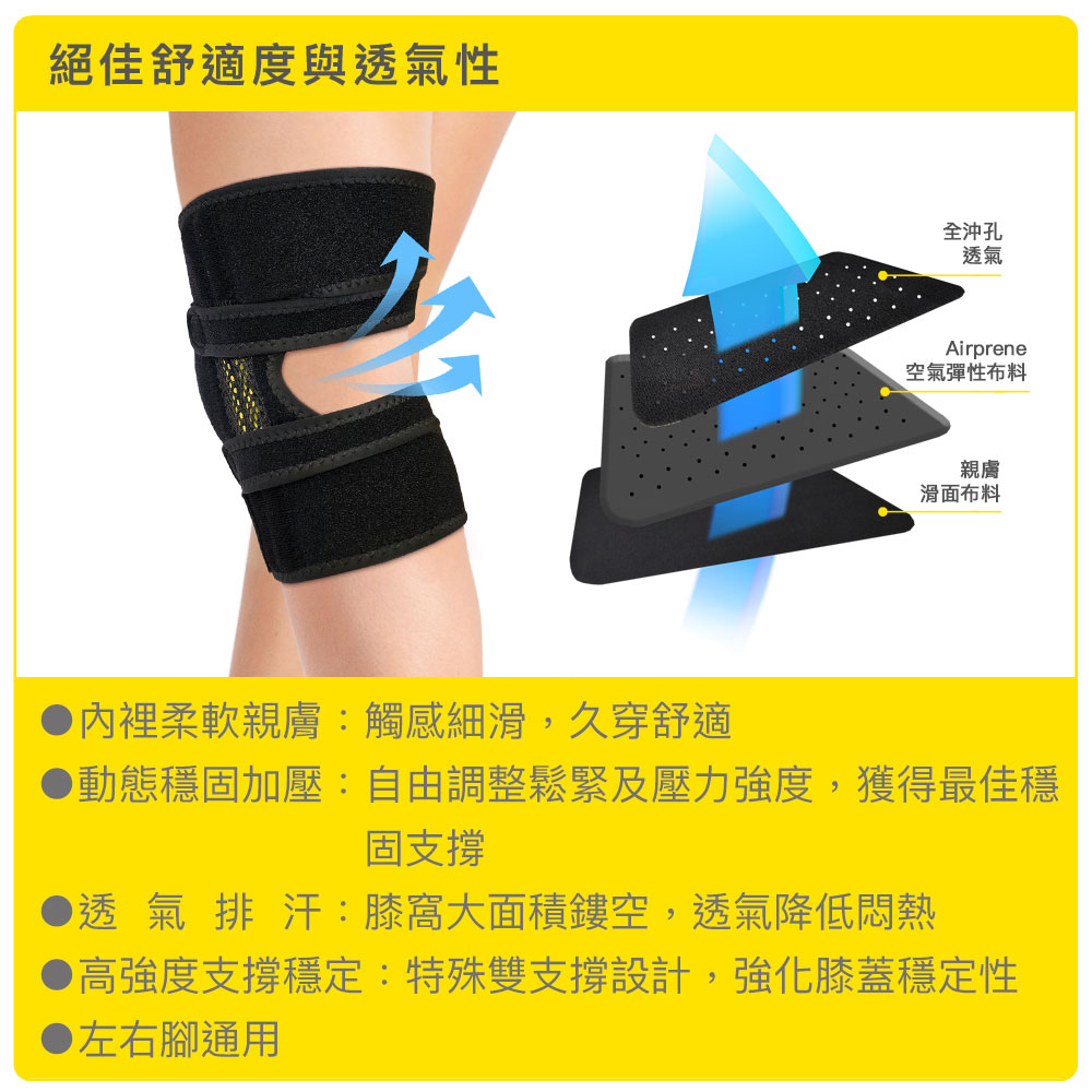 - 活動靈活更穩定:兩側雙金屬彈性支撐條,有效加強膝蓋兩側穩定,保有靈活度與活動範圍