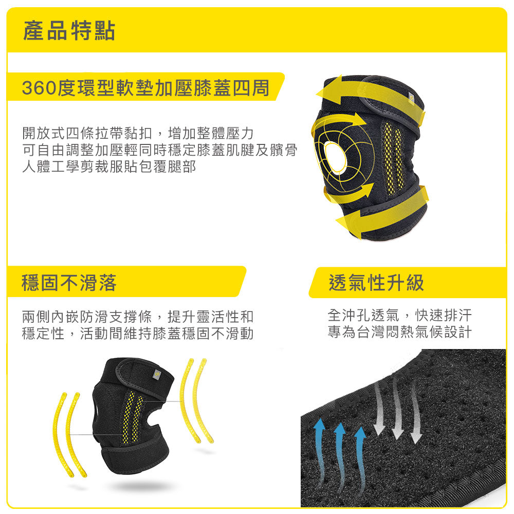 開放式四條彈力拉帶設計,輕鬆上下黏貼調整壓力,360゜環型軟墊穩定髕骨,有效分散膝關節壓力, 後膝窩開放設計,提升彎曲活動時的透氣性與舒適度